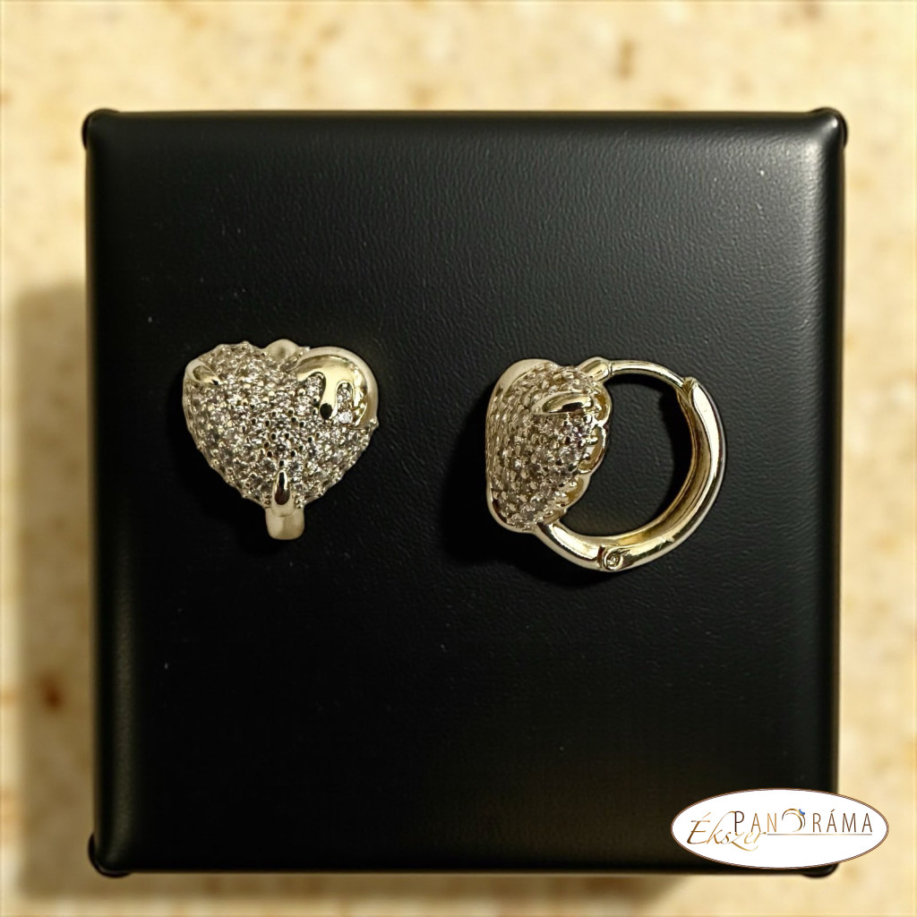 Mutatós, szív formájú ékszer, amelyet apró kristályok díszítenek.