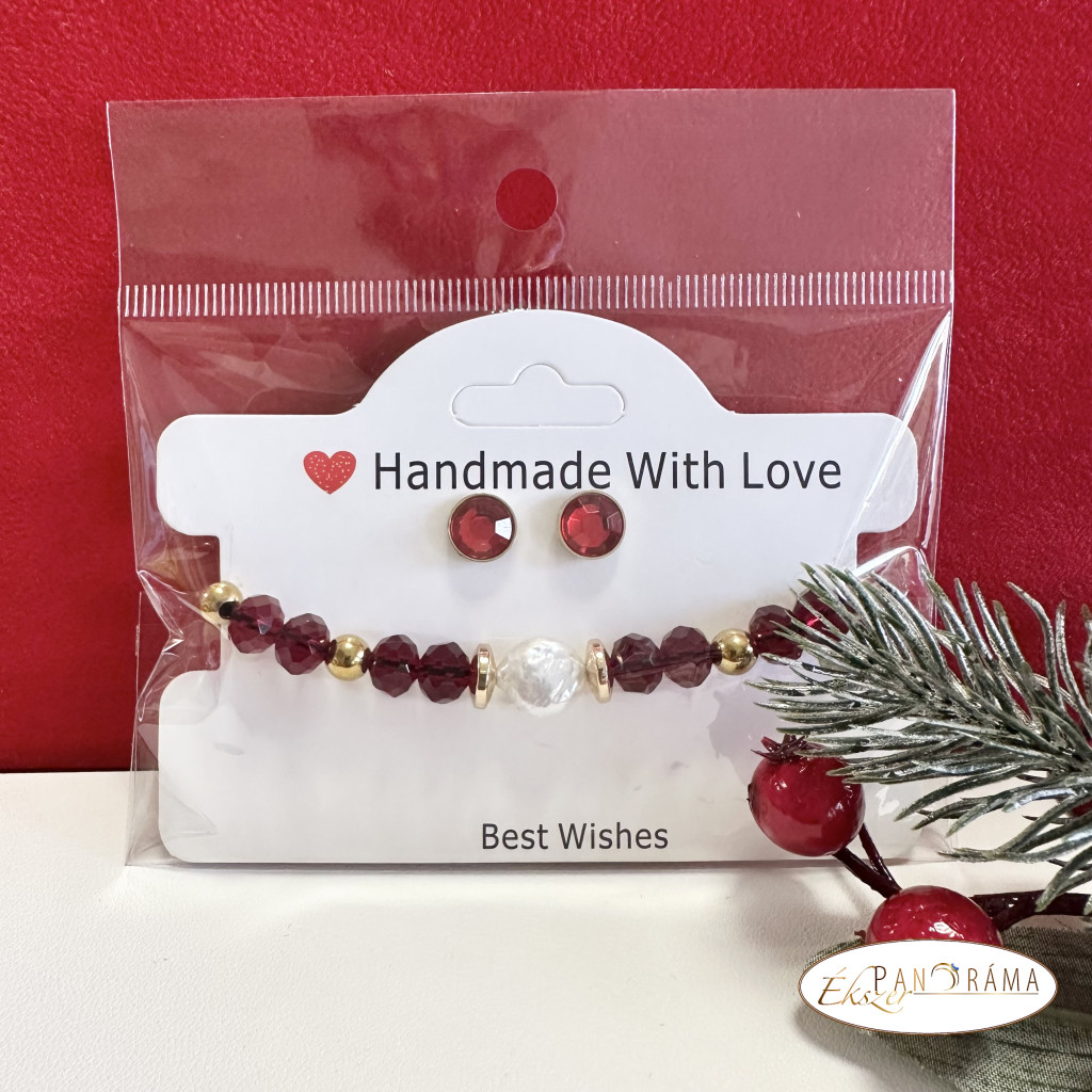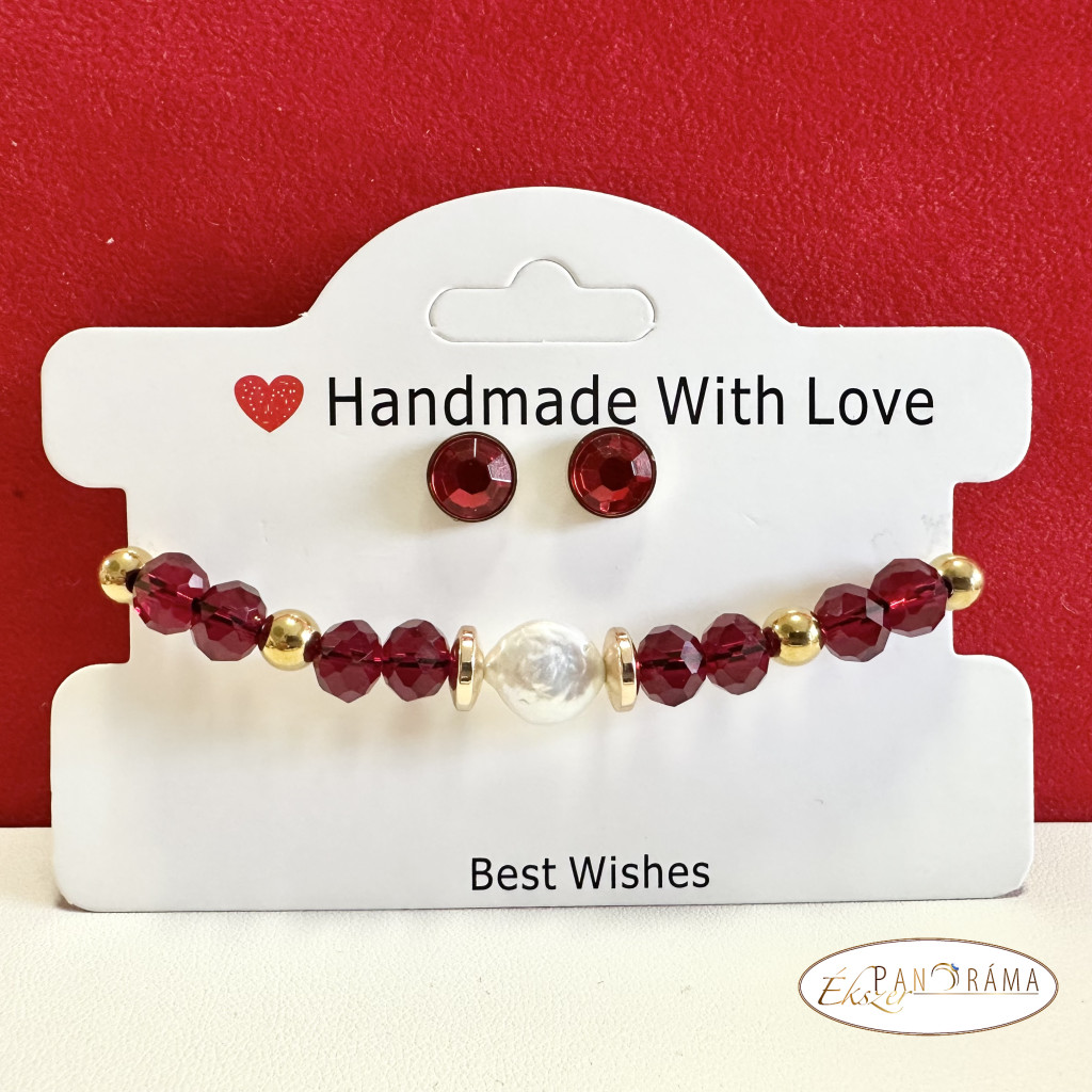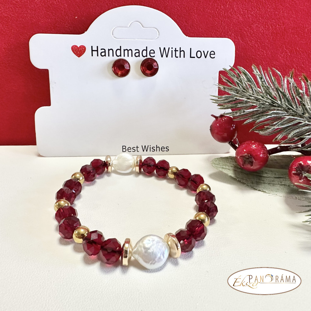Piros antiallergén beszúrós fülbevaló, valamint  egy  kézi készítésű  ásvány karkötő közepén lapos gyönggyel díszítve