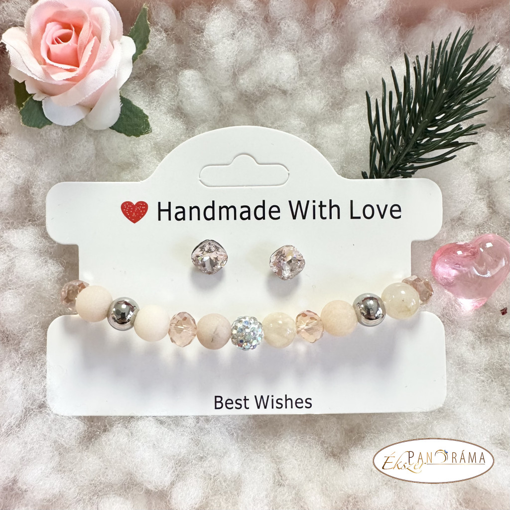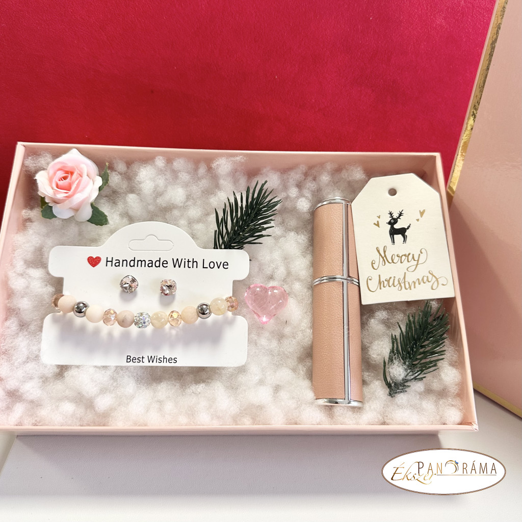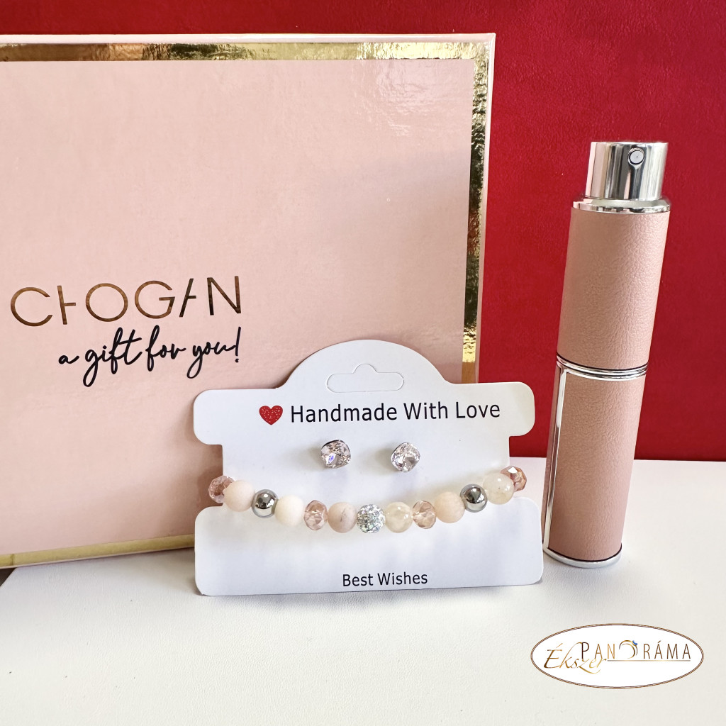 Gyönyörű díszdobozban eredeti párna kristályos beszúrós fülbevaló, egy kézi készítésű aventurin ásvány karkötővel, valamint a Chogan legújabb 148W illata egy utántölthető, bőr hatású, 10 ml táskaparfümben