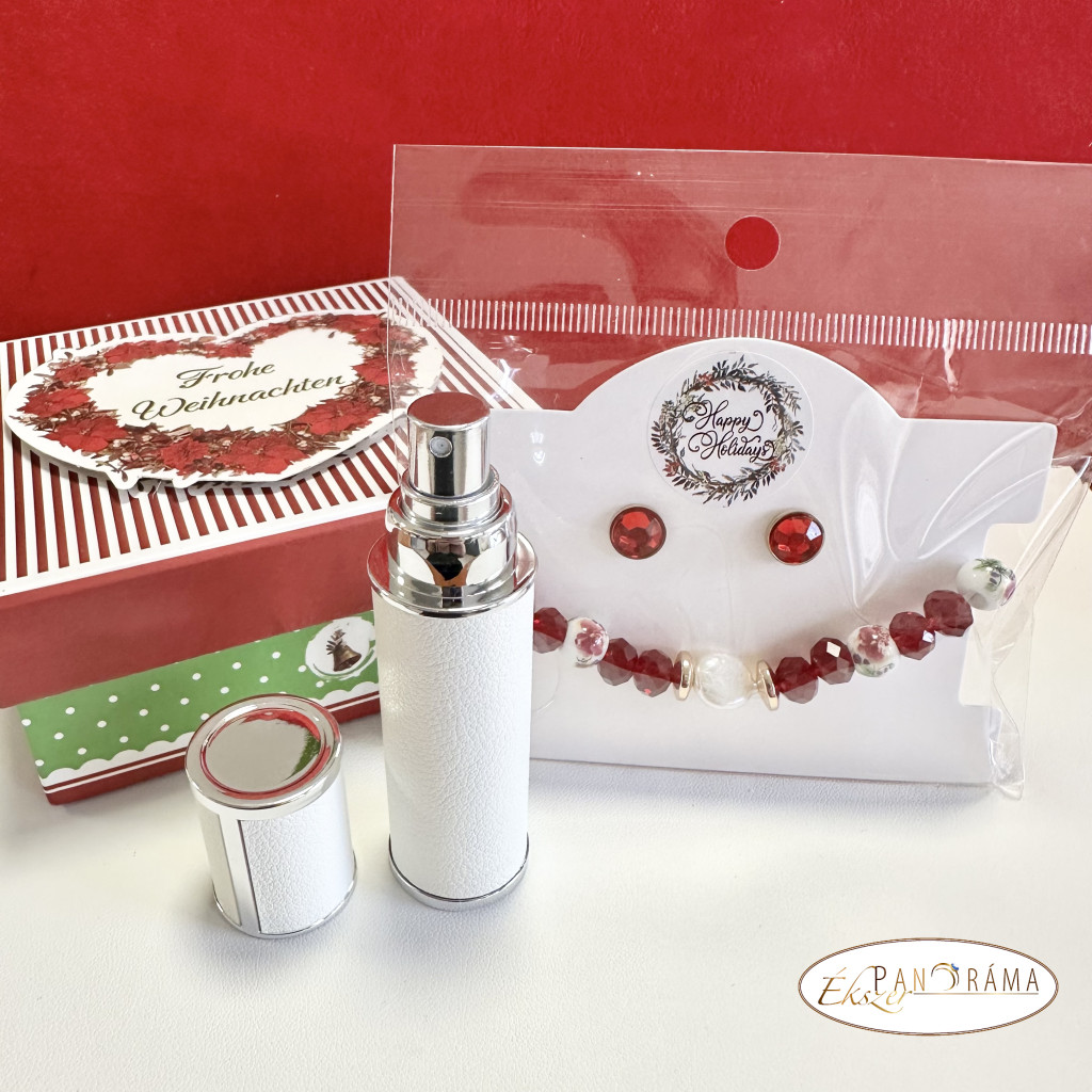 Gyönyörű karácsonyi díszdobozban piros kristályos beszúrós fülbevaló, egy kézi készítésű ásvány karkötővel, valamint a Chogan legújabb 148W illata egy utántölthető, bőr hatású, 10 ml táskaparfümben