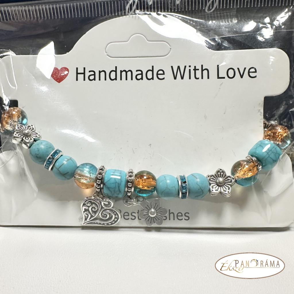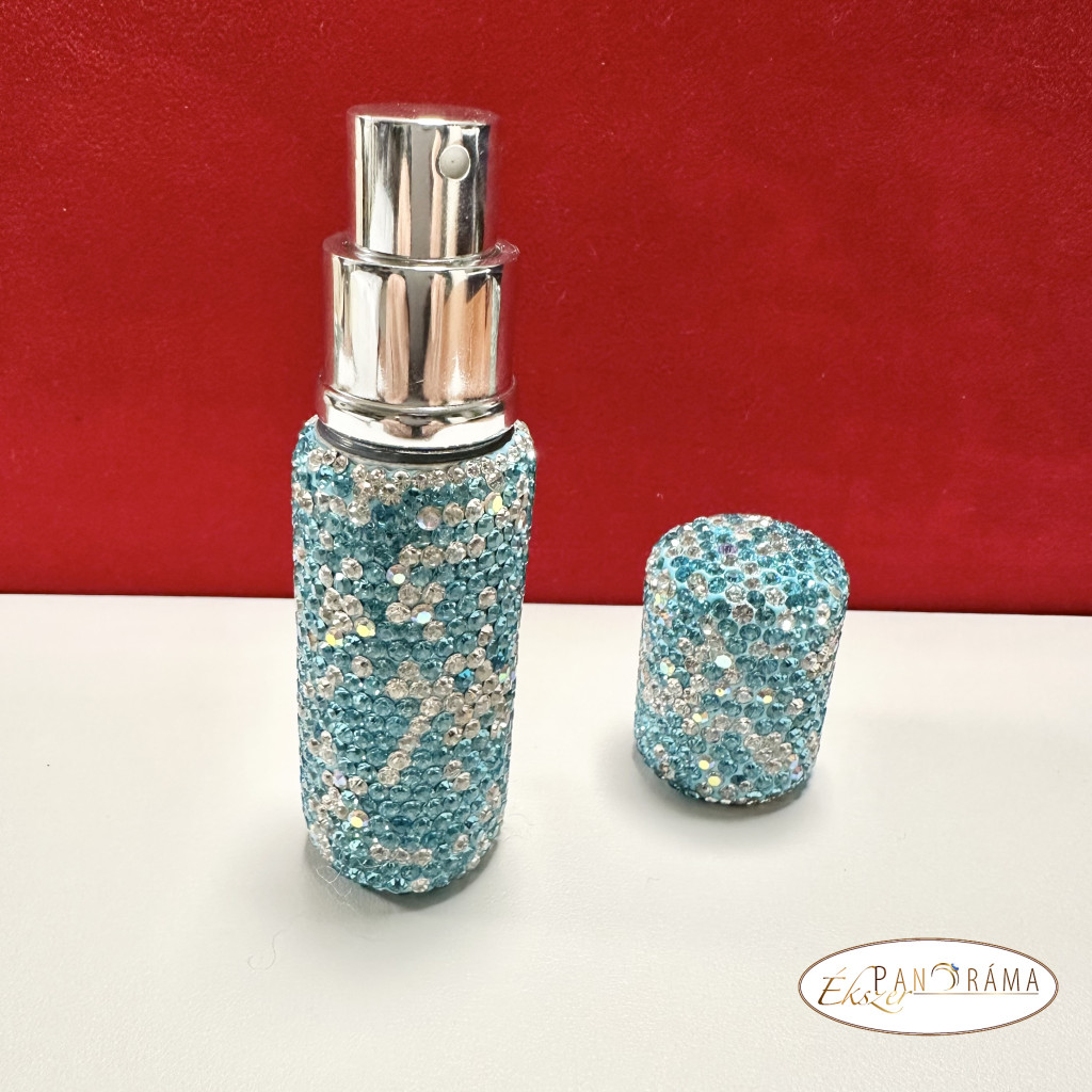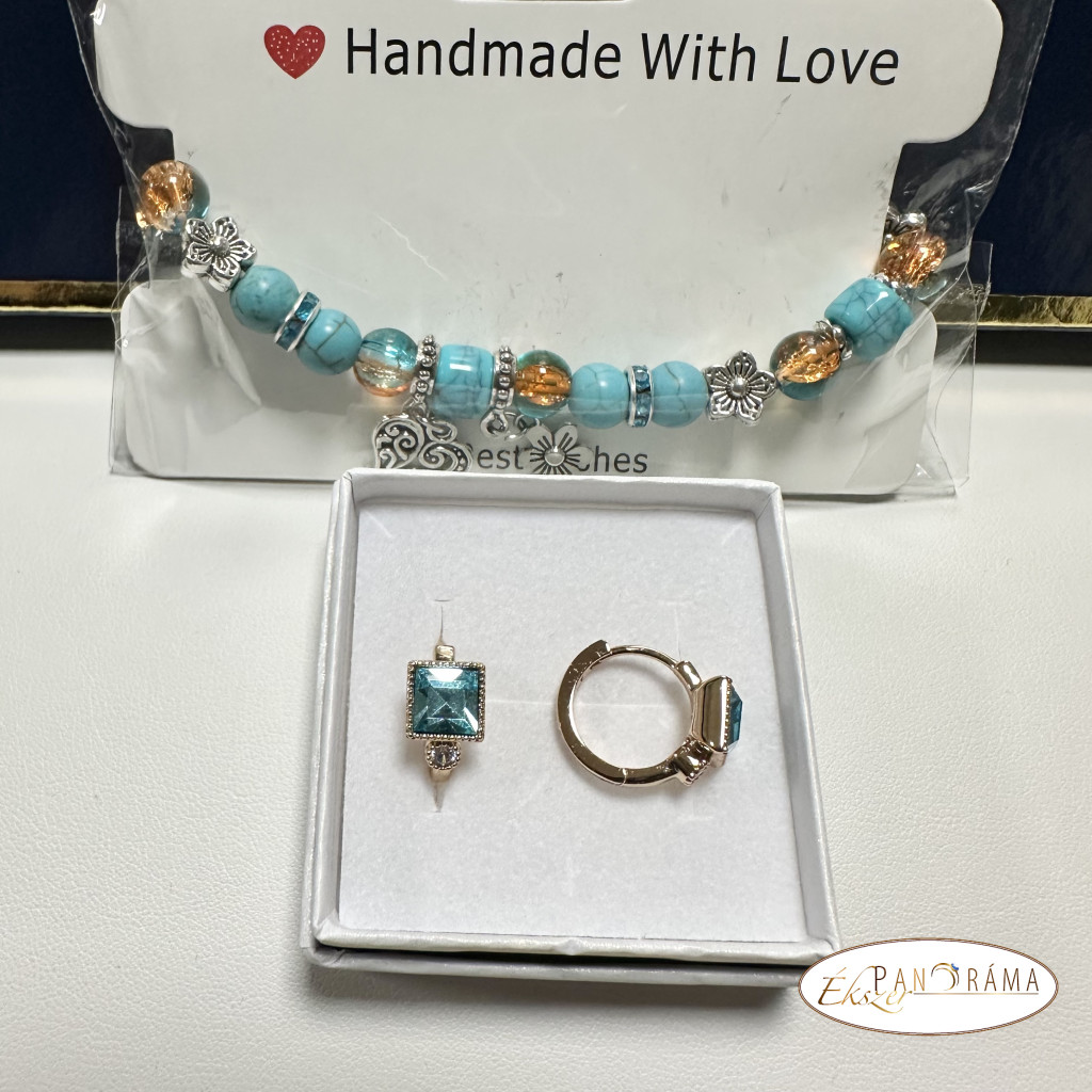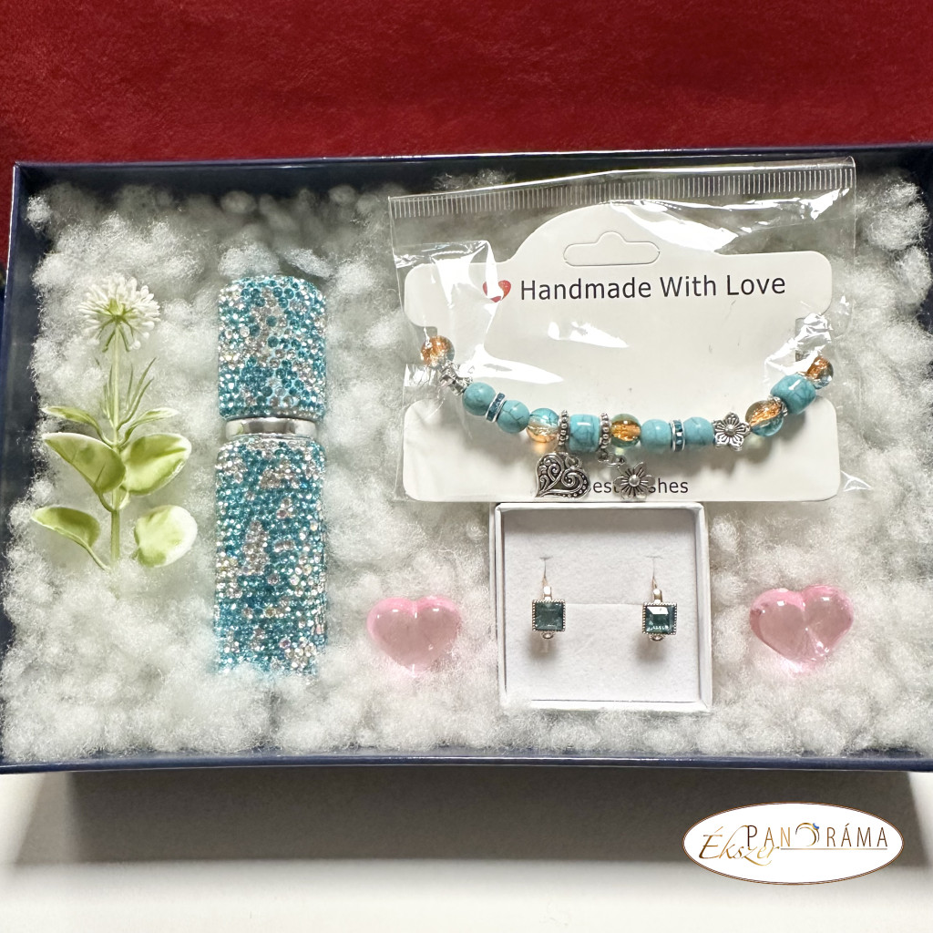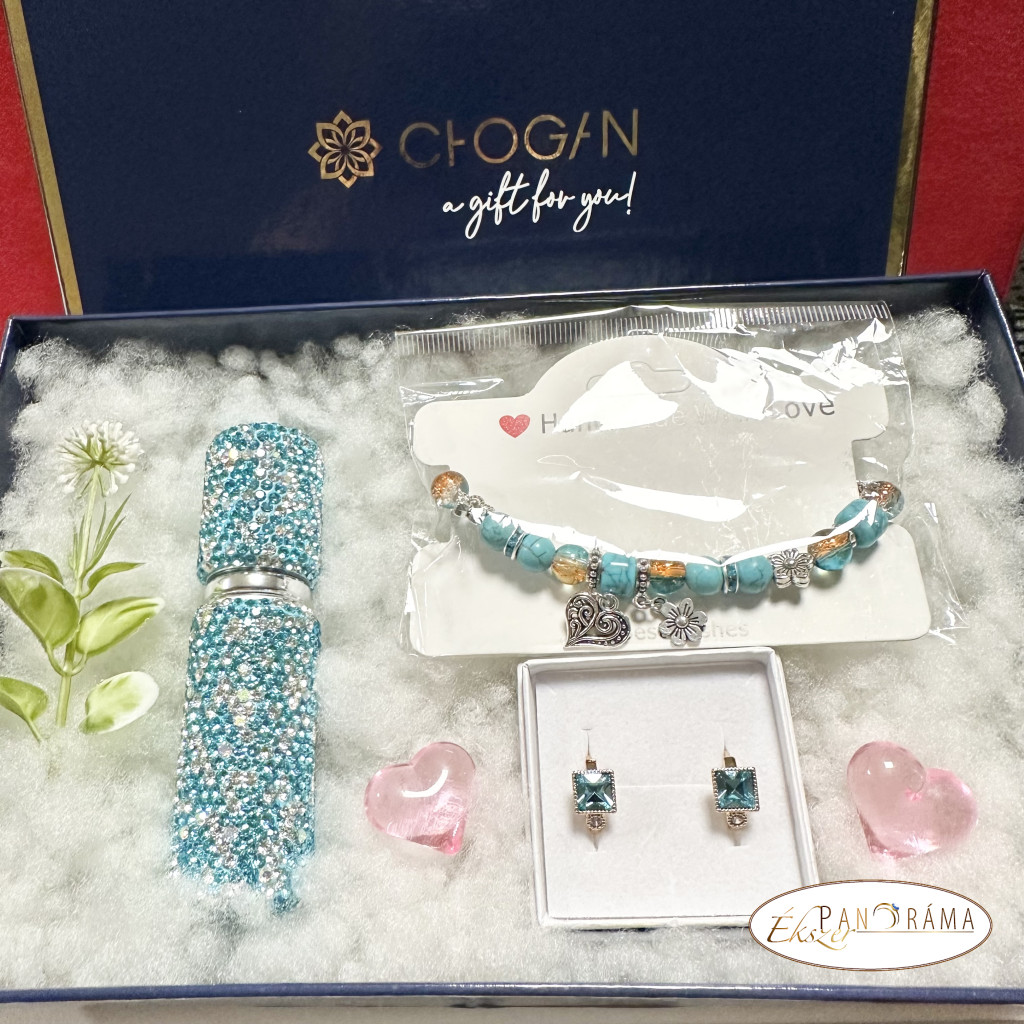 Kék vintage mintázatú díszdobozban türkiz gyöngy karkötő egy Gold Filled eredeti kristályos fülbevaló türkiz színű kristállyal, valamint egy újra tölthető türkiz színű kristályos táskaparfüm, benne Chogan 148W legújabb EDP
