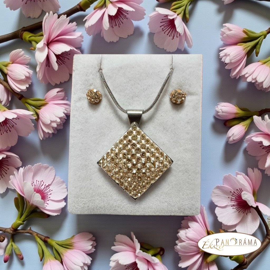 Pici apró kristályos beszúrós fülbevaló, hozzá egy különleges medál, szintén apró kristályokkal díszítve acél lánccal.