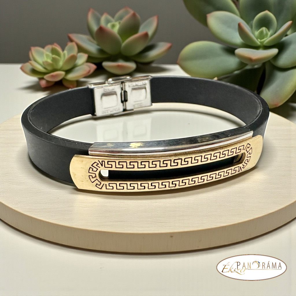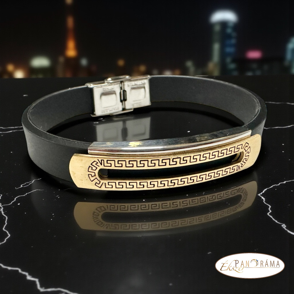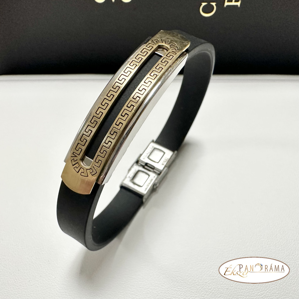 Nemesacél férfi karkötő, kaucsuk szíjjal, biztonságos kapcsolóval. Középen arany és ezüst szín kombinációja díszít!