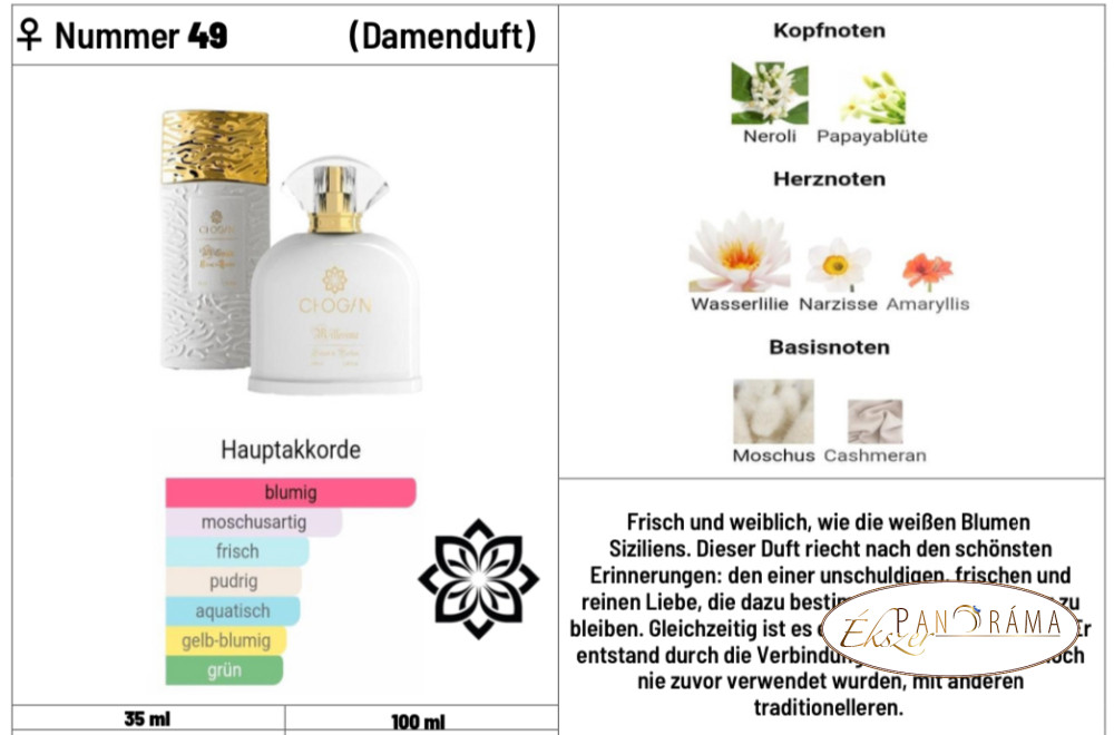 Friss és nőies, akár a fehér szicíliai virágok. Ez az illat a legkedvesebb emlékeket árasztja: egy ártatlan, friss és tiszta szerelemé, amely örökké fiatal marad. Ugyanakkor egy nagyon modern parfüm, amely a nem mindennapi esszenciák és a hagyományosabb esszenciák kombinálásával jött létre.