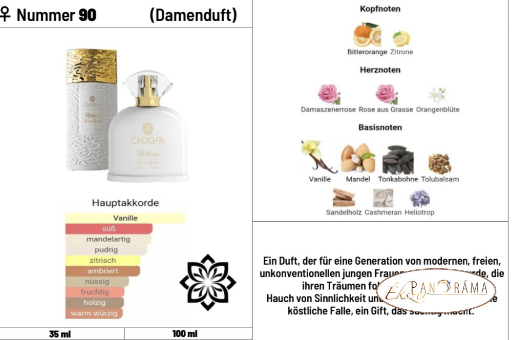 A Chogan parfümöknél 30% esszenciát (az uniós előírások szerint megengedett maximumot) és 70% növényi alkoholt találsz.